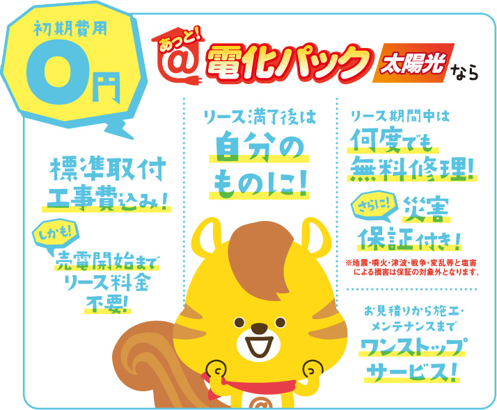 「あっと!電化パック太陽光シリーズ」は業界初!既築・新築向け住宅太陽光発電システムのリース制度です。太陽光で自家発電・自家消費することで、普段の電気代をかしこく節約!初期費用の負担がなく、無料修理保証付きというメリットに加え、10年間のリース契約終了後、メーカー保証を残してお客さまに無償譲渡いたします。